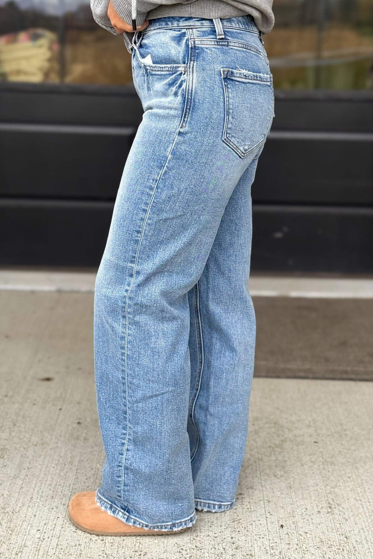 Embrace the iconic silhouette of the '90s with these Lovervet wide-leg jeans. Crafted from comfort stretch denim, they feature a super high rise waist that flatters and elongates your frame. Subtle distressed detailing adds vintage character, while the finished hem and full length create a polished, intentional look. Perfect for channeling retro style with modern comfort.