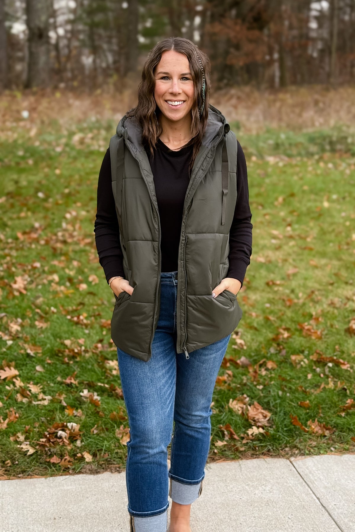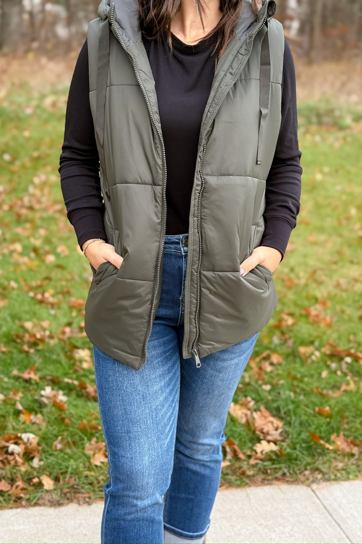 The Olive Hooded Puffer Vest combines practical layering with contemporary style. This mid-length design features a protective hood and secure zip closure, making it ideal for transitional weather. The olive hue pairs effortlessly with your existing wardrobe, while the lightweight puffer construction delivers warmth without bulk. Perfect for outdoor activities or casual everyday wear, this vest adapts to your lifestyle with understated sophistication.