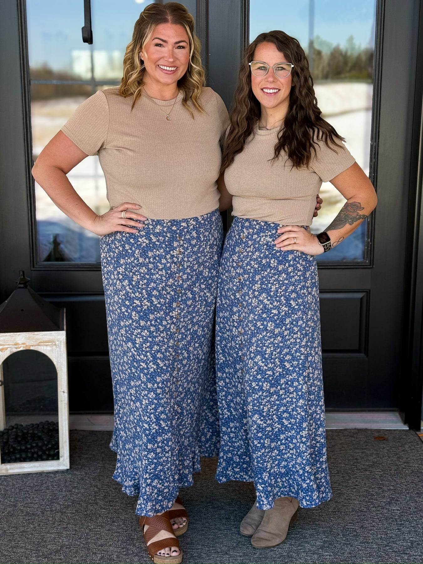 Embrace effortless elegance with this flowing maxi skirt featuring a charming ruffle detail and natural waist silhouette. The button accents add a touch of vintage-inspired sophistication, while the soft blue base adorned with cream and taupe florals creates a romantic, versatile look perfect for any season. A wardrobe essential that transitions seamlessly from day to evening.